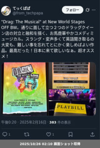 【ネタバレ分離】New World Stages「Drag: The Musical」の観劇メモです。