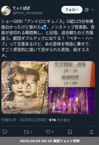 | 観劇日時 | 2023年12月04日 19時00分〜 |