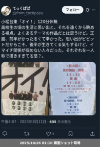 やはりある程度「青春時代の何か」共感するように描かれないと、2023年の振り返りのシーンに感情移入するのが難しい。・・・共感が難しいくらい他人が入り込めない青春時代、っていう描写を狙っているなら分かるけれど、そういう訳でもなさそう。妙に一人称で閉じた青春が描かれていて、これまでの小松台東の作品とは違い、かなりフラストレーションの溜まる舞台だった。