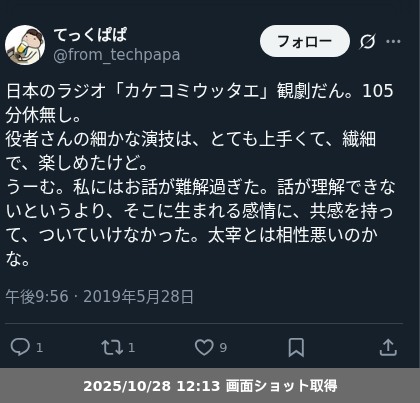 ・・・と、ここまで書いたところで、いつも観劇の感想を参考にさせていただいている方が「太宰治の原作とは、大分お話が違う」というのをtweetで教えていただいた。太宰との相性というより、劇団としてのアレンジや表現方法との相性だったのかもしれない。前回の公演を含め、とかく評価の高い感想が流れていたので、少し期待値を上げ過ぎてしまったかもしれない。