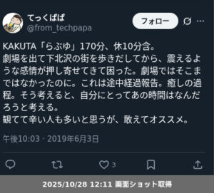 明転して。カーテンコール2回に拍手しつつ、やはり心の中で「服役した人の幸生きづらさ」と「田舎暮らし」と「震災の話」をうまくつなげらないでいた。その気持ちのまま、下北沢の街を歩き出して小劇場「楽園」の前あたりを歩いたところで、何だか言いしれぬ感情が襲ってきて思わず身震いしてしまった。