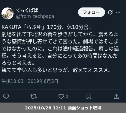 この作品「らぶゆ」は、まだ何かを正しく受け止めるには、まだ年月が、癒え方が、足りていない、という事を表現しているのかもしれない。そんな今の苦悩を、かろうじて切り取ろうとした舞台に思えた。劇場を出た後の方が、感情が押し寄せてくる。珍しい芝居だった。