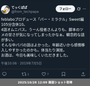 【観劇レポート】feblaboプロデュース「バー・ミラクル」(Sweet編)
