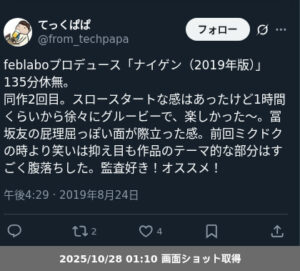 ストーリーを知っている自分としては、お話の展開そのものには、あまり驚く事は無い訳だけれど。今回、コの字型の席配置で、観客席の様子もよく観れる事もあり。きっと「ナイゲン」を初めて観る人なんだろうな、と思われる人の表情が、後半から大きく変わっていったのが、観ていて印象的だった。