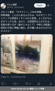 音楽の使い方が気になった。選曲も古いのが多かったけれど、気になったのは選曲ではなくて「使い方」。率直には「ちょっと古臭い感覚の、曲の使い方」だった。「このセリフのタイミング、この音量で、この歌詞のはっきりした曲を流すんだなぁ」という感覚。私自身が演劇を観初めた1990年代には、トップランナーの劇団にも、こういう演出は多かったように思う。出来の悪い芝居でも、音楽に乗せてとりあえず強制的に感動させる的な演出を、昔は結構観た気がする。今の若い人の小劇場の演劇を観ると、こんな風に音楽を使うケースは、実は少ない。そんな事もあり、久しぶりのノスタルジックな曲の使い方の感覚に、ちょっと面食らってしまった部分もあった。一方で「カチナシ!」、2時間の芝居に比して登場人物が多いにもかかわらず、それぞれの個性みたいなものが見えたので、「音楽に乗せられて」感動しました、という嫌な感覚とは無縁だった。淡々とした物語と相まって、いつしか「心地よいノスタルジー」を感じるようになっていた。・・・たまにはこういうのもいいかな、と。