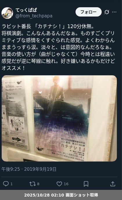 本編。ものすごく感情の山・谷があるお芝居のはずなのに、描き方がとても淡々と淡々と、していて。逆に淡々とした感覚のままクライマックスの対局のシーンまで運ばれるるので、その感覚が良かったのだろうかとも思う。もっと、ドラマチック過ぎた演出をすることも出来たと思う。例えば、最後の「角、成らず」なんて、もっともっと盛り上げてもいいのに、と思ったけれど。淡々と進む。その結果、単純な感情というのか、すごく原始的な感情を、直接揺さぶられたような感覚がして、気が付くとうっすらと涙していた。そして終演後は、底抜けに清々しい。そんな不思議な感覚のお芝居だった。
