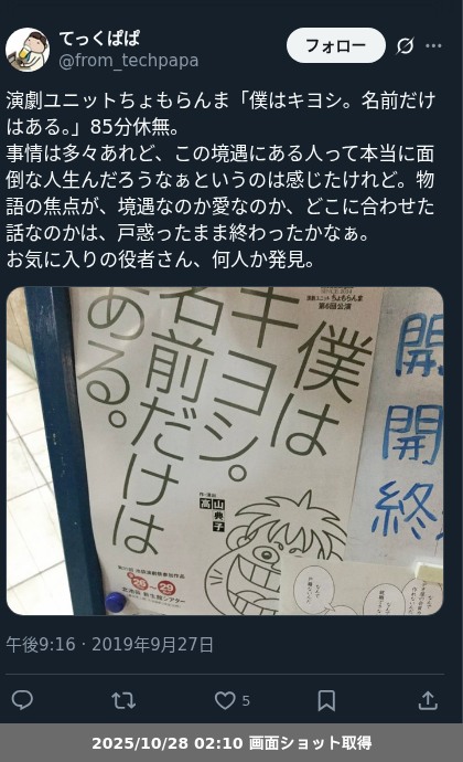 【観劇レポート】演劇ユニットちょもらんま「僕はキヨシ。名前だけはある。」