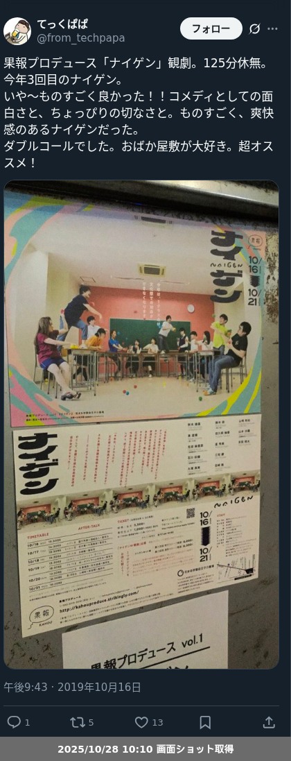 特に、セリフを喋っている役者さんの外に目を向けても、物語の成立度、演技の完成度、会話の成立度がとても高いな、と感じる。ほとんどの役者さんが舞台に出ずっぱりだけれど、どの部分に視線を落としても、楽しめるような気がする。その意味で、複数回、観たいなぁ。本線を邪魔しない、アドリブっぽいセリフが、他のナイゲンよりも若干多かったのも特徴じゃないか、と感じる。