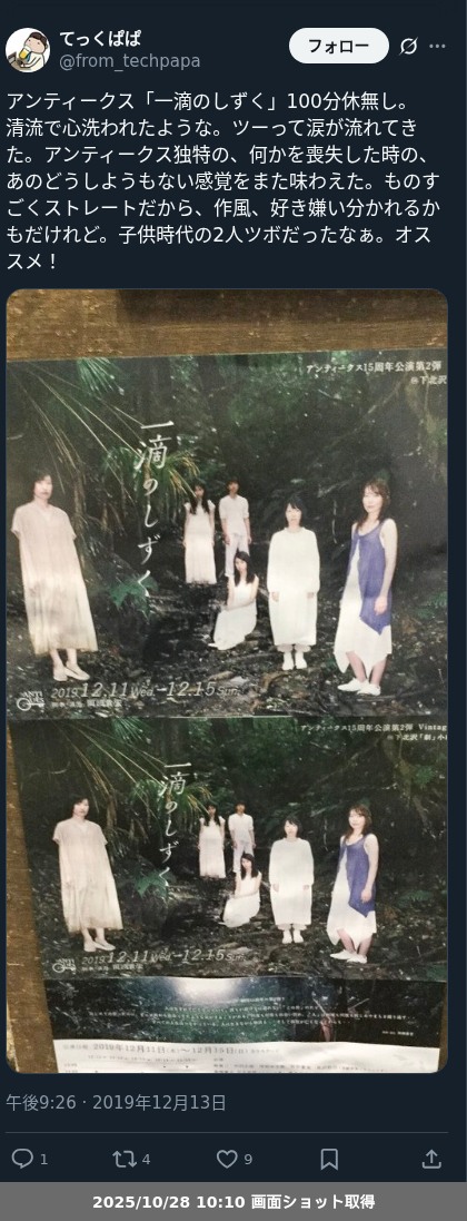 悪く言えば「臭い」という路線を、幹の太い感情のうねりとして、しっかりと作品化してくれる。アンティークスは、そんな魅力がある劇団だなぁ、と再認識した。そして、劇団を観続けて少しずつ気になってしまうのは、この作品群の原体験は、一体どうゆうものなのだろうか、という事。・・・まあ、種明かしをする必要は、実はないのかもしれないけれど。