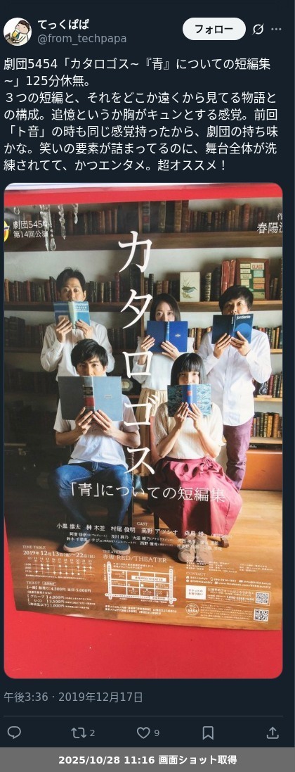 前回観た芝居が楽しかったのと、twitterでの評判が良いのと、好きな役者さんが出演されているからです。