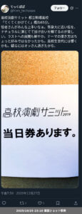 ベケットの「何かを待っている」という不条理作品を高校生の設定でやって見せる、という点においては、私自身は、新たなテーマや命題、みたいな部分を、作品に見出す事は出来なかった。ゴドーのパロディの手法で、ベケットが主張しているのとは異なる新しいテーマを提示している作品は、古今たくさんある。しかしこの作品は、テーマ性という意味では、ベケットと同じ世界の捉え方をした、と感じた。顧問の創作脚本の作品かと思いきや、当日パンフレットを見る限りは、演劇部員。高校二年生の作品。ベケットを料理しているのと、この絶妙な男子高校生の感覚を、脚本に盛り込んでいるのは、ただただスゴイ。