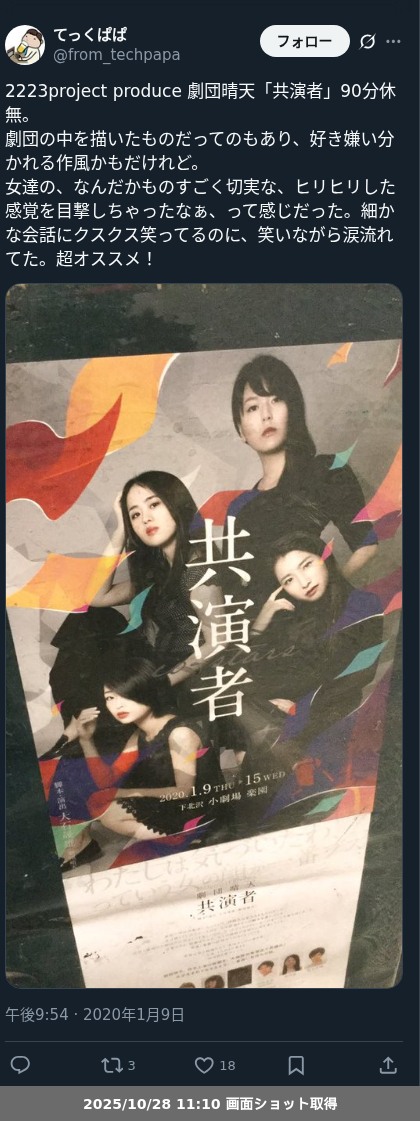 突然出てくる「想像を超えろ」なんて言葉。あまりにも唐突なセリフなのに、ああ、この4人がもう一度つながるためには、想像を超えて行かないと無理だよな、なんていう納得感もあり。細かく間違う言葉や、小ネタのギャグに、クスクスと笑いを誘われながらも、その感情の爆発と、切実さに、思わず涙を流さずにはいられなかった。ここまで見事な「悲劇なのに喜劇」っていうシーンは、久々にお目にかかった気がする。周りからも、クスクス笑のはざまにすすり泣く声が結構して。舞台で扱われているテーマが、劇団の舞台裏、という事もあり。あ~この客席の感覚、演劇だなぁ、何てことを思っていた自分がいた。