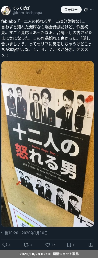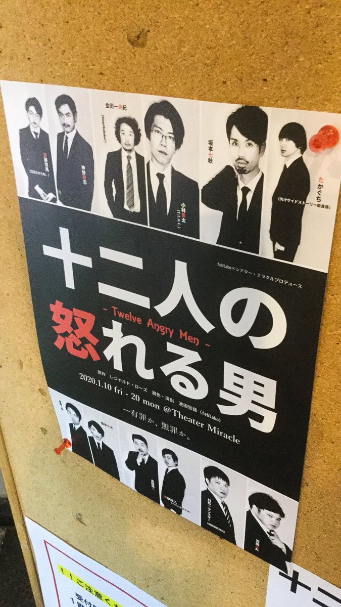 気になった役者さん。1号:吉田覚丸、体が大きくて目立ったのもあるけれど、やはりこういう会話劇作品は軸になる人がしっかりしてないと不安になる。1950年代にいそうな、ちょっと太めのお兄さんという感覚と、場の回し方がとても好き。4号:小林勇太、有罪主張するチームが、どちらかというと「感情」に流されて決めている感があるストーリーたけれど。「有罪」の納得の仕方を一緒にトレースして味わった感覚。座った席から、丁度斜めの角度の、かっこいい感じも観れた。7号:金田一央紀、先日見たfeblaboの「バー・ミラクル」で、愛人契約をしてチューしていた役者さんとは思えない変わり様。前記の通り、古い戯曲なのでたまに「ん?、古い表現だな」っていう台詞がママある芝居なんだけれど、金田一央紀のセリフには、あまりそれを感じなくて、自然に見れた。8号:坂本七秋、こちらもfeblaboで何度か拝見している役者さん。私、大好きです。feblabo以外でも拝見したいと思いつつ、まだあたった事なく。