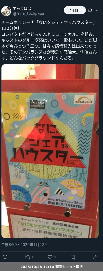 【観劇レポート】チームホッシーナ「なにをシェアするハウスター」