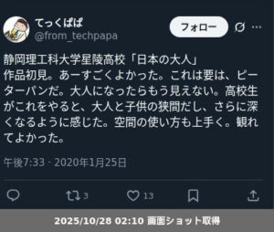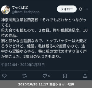 割と静かな会話劇なので、トップバッターは大変だろうけどけど、健闘。私は観るの2度目なので、途中から涙腺ゆるゆる。特に親の世代のすすり泣く声が聞こえた。2度目の気づきもあり。