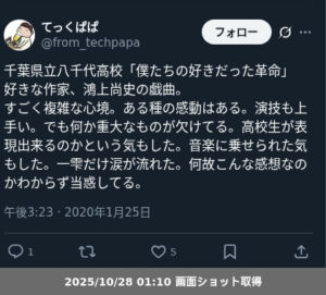 ただ、一つの舞台、一つの演劇作品としては、あまり感情を刺激しなかった。その乖離が激しくて、何故だろ、と思い巡らせてしまった。声量小さめ。