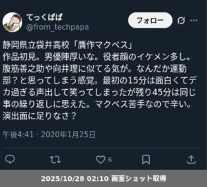 前半15分くらいは面白い。マクベスの世界に、それぞれ思い思いにやりたい事を持ち込んで、話をメチャクチャにしていく・・・というか、面白くしていく話。作品のテーマ的には、「結局、創作には誰かの自己満足的な部分が含まれている」という事。なるほどな、話としては面白く出来ているな、と思うも。最初の15分位に出てくる、「古畑任三郎」や「かばおくん」「擬音で効果音」などの要素が、結果的には繰り返されているだけのように感じてしまい、15分位で飽きが来てしまった事。しかも、飽きた後に残るのは、私の嫌いなシェークスピアの「マクベス」。ちょっと退屈かもな・・・とウトウトしてしまった。なんか、同じネタで何度も笑いを取る芸人のように見えてしまった。中屋敷法仁が創った時の事は分からないけれど、もう少し演出的に魅せていかないと、1時間もたせるのは厳しいかもしれない。役者さんが皆、魅力的。特に男優陣が魅力的。体の動かし方も含めて、あれ、どこかの運動部?、のような気がしたが、みんな演劇部員なら羨ましいところ。