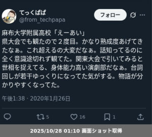 県大会でも観たので2度目。かなり熟成度あげてきたなぁ。これ超えるの大変だなぁ。話知ってるのに全く意識途切れず観てた。関東大会で引いてみると世相を捉えてる、身体能力高い演劇部だなぁ。台詞回しが若干ゆっくりになってた気がする。物語が分かりやすくなってた。