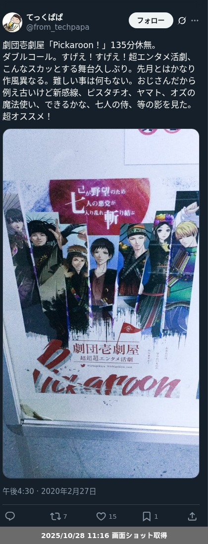 何故か、過去のいろんな作品を思い出す。劇団新感線の芝居だったり、惑星ピスタチオだったり、「宇宙戦艦ヤマト」っぽいシチュエーションだったり、これって「天空の城ラピュタ」じゃないと思ったり、「オズの魔法使い」のカカシや「できるかな」を思い出したり。そしてもちろん「7人の侍」もあり。・・・新感線とピスタチオはともかく、「パロディ」な芝居では全くないのに、なんでこんな雑多な作品を思い出すのだろう。人間の性か、どうしても「他の作品との類似」で理解しようとしてしまう。しかもオジサンだから、例える例が、古い。我ながら、語彙が貧弱だなぁ・・・と改めて認識する。