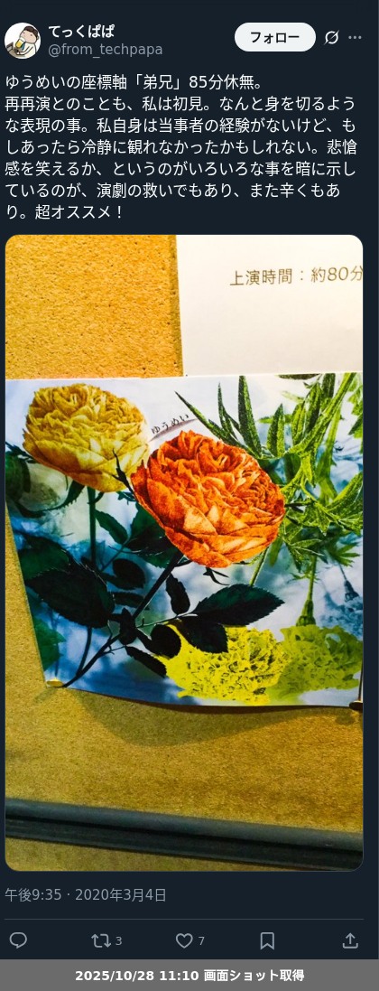 その流れで。作者の池田亮は「兄」だと思っていたのだけれど、当日パンフレットを読むと「兄」なのか「弟」なのか、分からなくなってきてしまう。この記載だと「弟」が、池田亮の物語とも取れてしまう。…そう考えると、この物語全体が、限りなく真実をベースにした「虚構」、という気もしてくる(だからといって、重みが消えるわけではないけれども)。前回の「姿」が、実の父母が出演していたこともあり、真実の物語、という気もする。段々、分からなくなる。