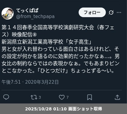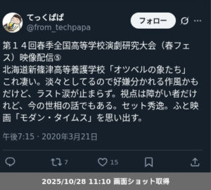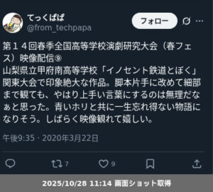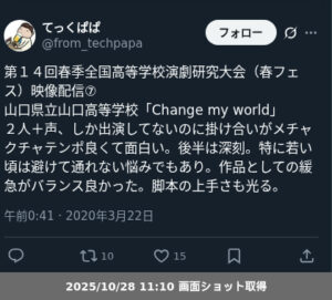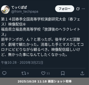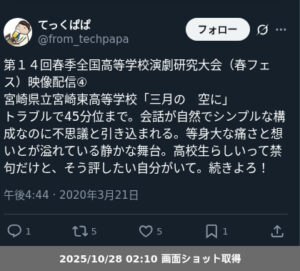 高校演劇 春フェス大会。今年はコロナウイルスの影響でオンライン開催です。