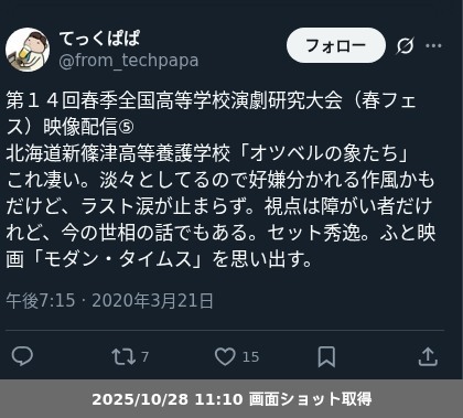 コロナウイルスで、大会も中止(映像配信)になり。日本全体で(いや、世界全体で)中止になった興行が多く、演劇や芸術、俳優業が「本当に必要か?」などと言われる事にも、奇しくも対応している。むしろ、本当に大事なら、マスクして消毒して、感染にビビりながらでも上演したい、観たい、という想いがうまれてくる。映像配信は有難いけれど、作品の性質を考えると、やはり生で観たかった、というのを強く感じた作品だった。きっと、何よりも生で伝えたかった、という想いが強い作品ではないかと思った。