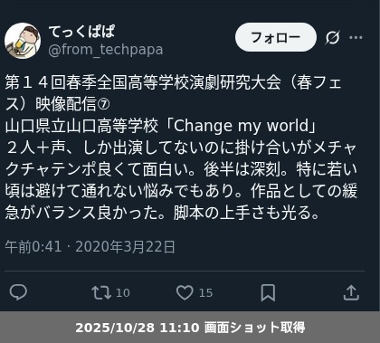 | 山口県立山口高等学校 | Change my world | 作:川上そよ香 潤色:山口高校演劇部 | 21日 17:00~ |