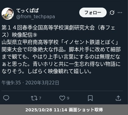 | 山梨県立甲府南高等学校 | イノセント鉄道とぼく | 作:中村勉 | 22日 14:00~ |