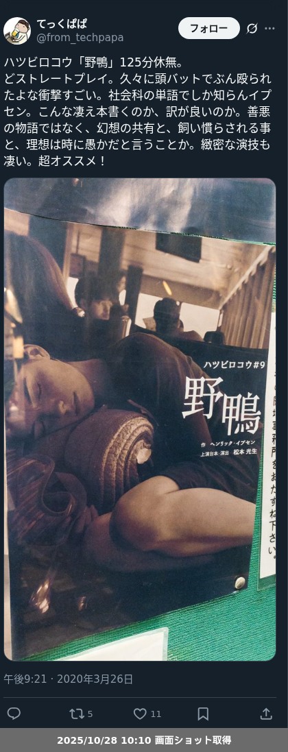 まず、イプセンの脚本凄いな…。社会科の授業で「イプセン=人形の家」で、割と点数ゲットしやすい項目だったので覚えていた。ただ「野鴨」って作品は全く知らなかった。観ていて、あーこんなすごい作品あるんだ、と思った。言葉にしてしまうと、ちょっと複雑に感じる物語だし、時代設定は古いままの作品だったけれど(劇中で明示されないけれど、1890年代?)、現代でも古くない、というか、通用しない点が殆ど無いという点。劇として展開されると、ストレートプレイ独特の前半の退屈さはあるものの、気が付くと傾倒して観入ってしまうような物語。上演台本は、演出の松本光生によるものとの事だが、原典からの翻訳なり変換の段階で成功しているのかもしれない。イプセンの原典に当たってみたい、という思いが産まれる。