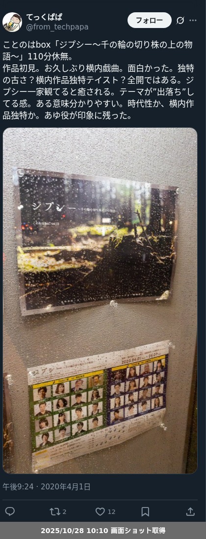 思えば?改めて?他の横内作品を脳内で振り返ってみると、そういう対立の作品多いな、というのに気がつく(真っ先に思いついたのは「新羅生門」)。これが横内テイストの正体か?はたまた古さというか懐かしさの正体か?と再度そこで頭がグルグルする。ふと思えば、大橋泰彦の「ゴジラ」も、よくよく考えてみると「彼氏がゴジラ」とか、ほぼ設定がテーマ、っていう「出落ち」な気がするし、そういう時代だったのかなぁ、とも思う。(ゴジラは1987年、ジプシーは1989年)。いずれにしても、隠喩になってないような、直接的にテーマを語ってしまう作品って最近見ないよなぁ。今を生きて、物語に慣れている人には、少し響きが足りないんじゃないかなぁ、なんてことを思う。カーテンコールで、どなたかが「戯曲の強さ」って言ってたけれど、そこまでの強さを感じない、というのが正直なところではあった。