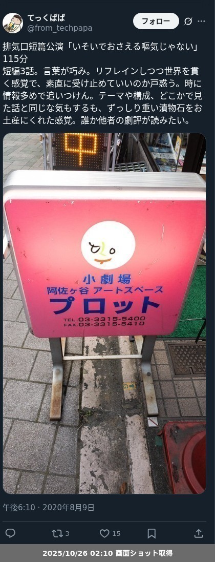 帰路に尽きながら、得体のしれない重さを感じつつも、何が残ったのかと問われると、やはり物語である以上、私の場合はテーマが大事。前に書いた、既存の物語との類似点みたいなものが、どうしても、何度も、何度も、思い出されてしまう。短編集で今回だけが特別なのか、この劇団の作風なのか、この作品だけでは分からない。独自の価値観が物語の中で提示されたら、どうなるのか。その時の公演を観てみたいと思うようになった。