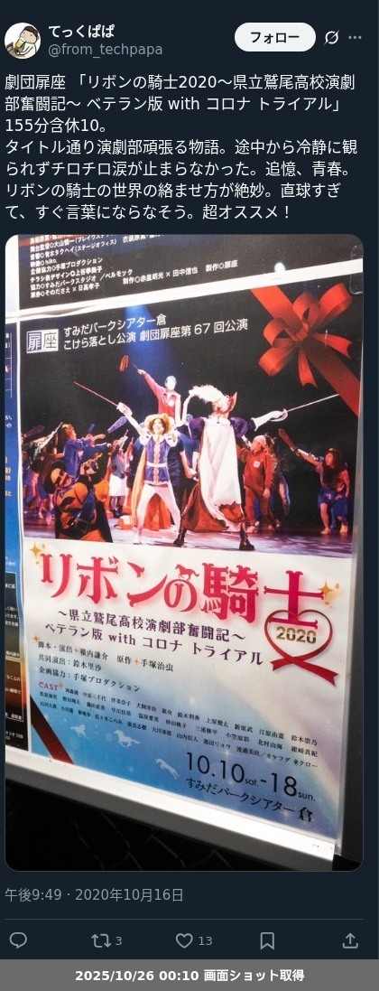 【ネタバレ分離】昨日観た芝居、 劇団扉座「リボンの騎士2020~県立鷲尾高校演劇部奮闘記~ ベテラン版 with コロナ トライアル」の観劇レポートです。