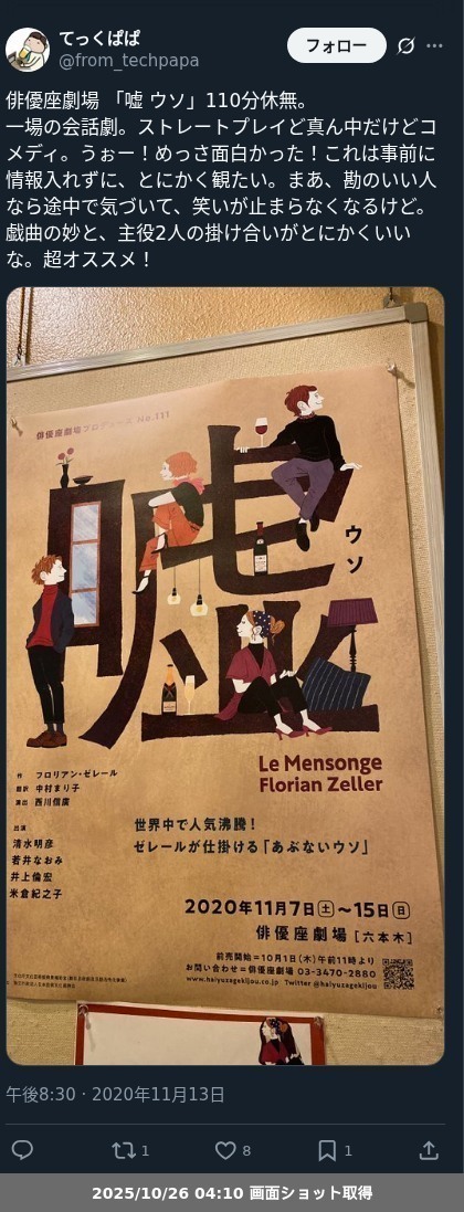 【ネタバレ分離】昨日観た芝居、 俳優座劇場「嘘 ウソ」の観劇レポートです。