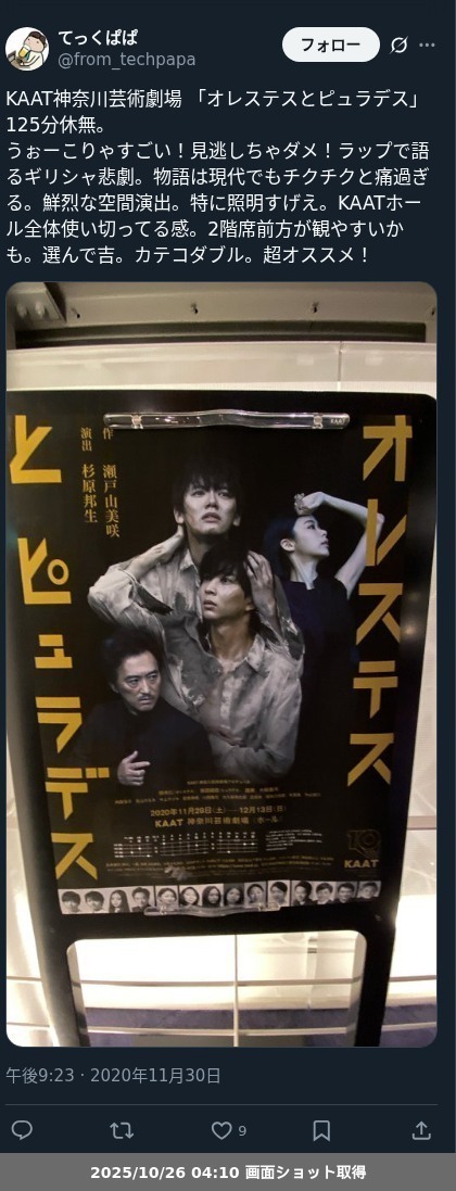 【ネタバレ分離】昨日観た芝居、 KAAT神奈川芸術劇場「オレステスとピュラデス」の観劇レポートです。