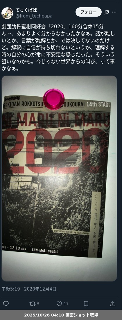 【ネタバレ分離】昨日観た芝居、 劇団肋骨蜜柑同好会「2020」の観劇レポートです。