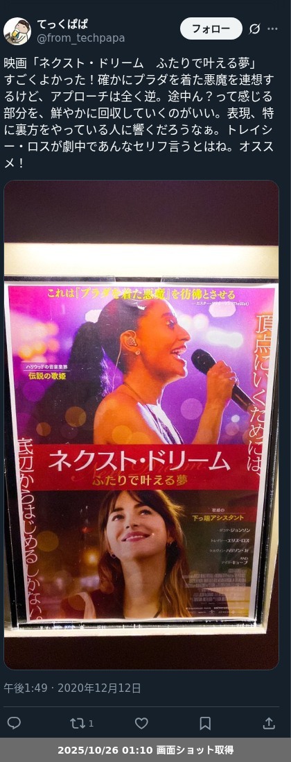映画「ネクスト・ドリーム ふたりで叶える夢」 すごくよかった!確かにプラダを着た悪魔を連想するけど、アプローチは全く逆。途中ん?って感じる部分を、鮮やかに回収していくのがいい。表現、特に裏方をやっている人に響くだろうなぁ。トレイシー・ロスが劇中であんなセリフ言うとはね。オススメ!