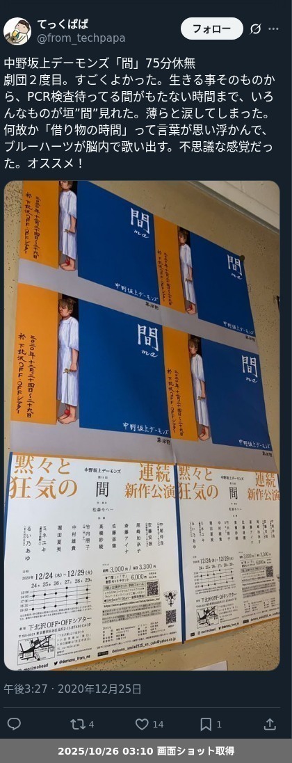 【ネタバレ分離】昨日観た芝居、 中野坂上デーモンズ「間」の観劇レポートです。