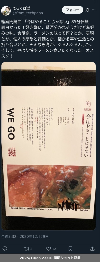 口コミだけで客が増える演劇に対する揶揄、それでも客を呼んで演劇を商売として成り立たせて食べていくことも大事かもしれない。スタッフワークを劇団外に依頼したりする事は、麺の自家製と同じで「こだわりがない」訳ではないはずだ。けれど、きっと外部に委託できない、劇団というラーメンの味を決定づける要素もあるのだろうと思う。