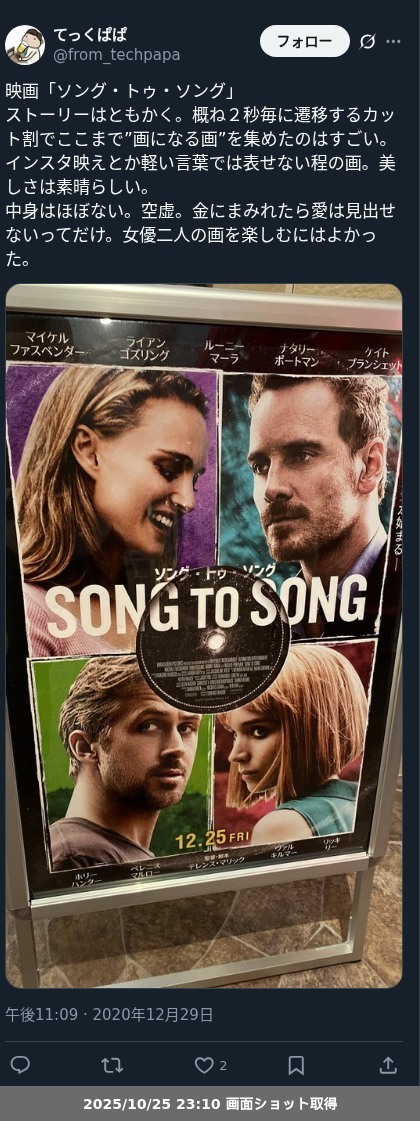 【ネタバレ分離】昨日観た映画、「ソング・トゥ・ソング」の鑑賞レポートです。