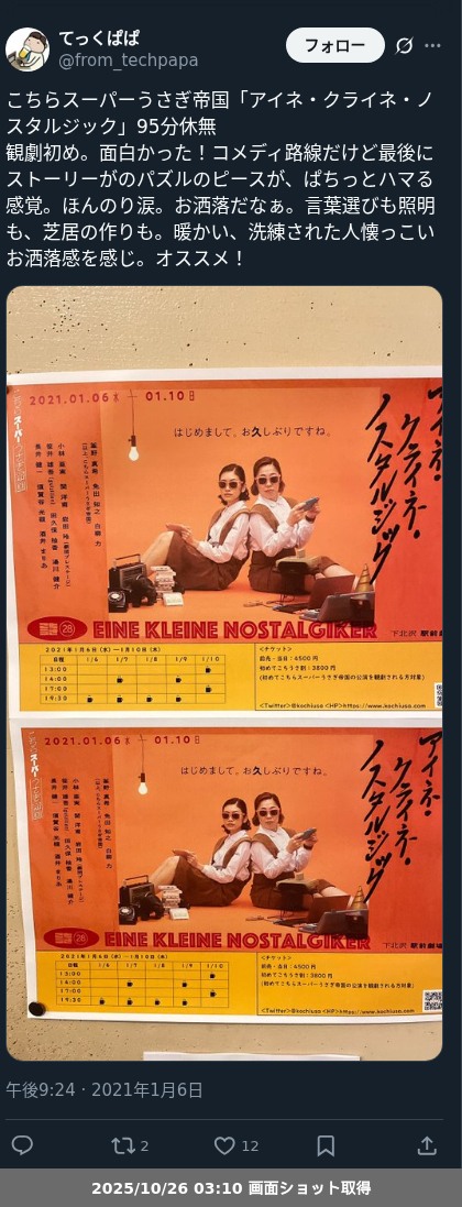 【ネタバレ分離】昨日観た芝居、 こちらスーパーうさぎ帝国「アイネ・クライネ・ノスタルジック」の観劇レポートです。