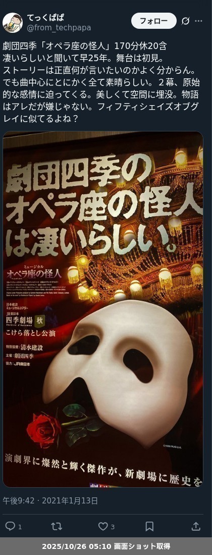 【ネタバレ分離】昨日観た芝居、 劇団四季「オペラ座の怪人」の観劇レポートです。