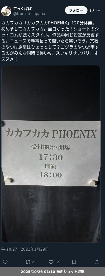 【ネタバレ分離】昨日観た芝居、 カカフカカ企画「カカフカカPHOENIX」の観劇レポートです。