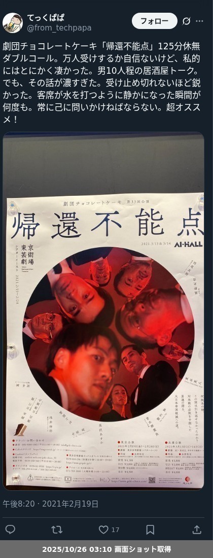 ダブルコール。万人受けするか自信ないけど、私的にはとにかく凄かった。男10人程の居酒屋トーク。でも、その話が濃すぎた。受け止め切れないほど鋭かった。客席が水を打つように静かになった瞬間が何度も。常に己に問いかけねばならない。超オススメ!