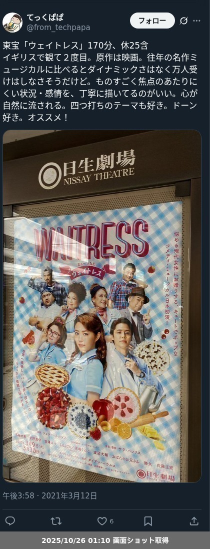 【ネタバレ分離】昨日観た芝居、 東宝/フジテレビジョン/キョードー東京「ウェイトレス」の観劇レポートです。