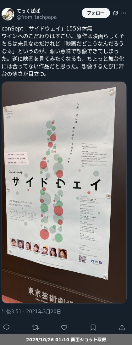 【ネタバレ分離】昨日観た芝居、 conSept「サイドウェイ」の観劇レポートです。