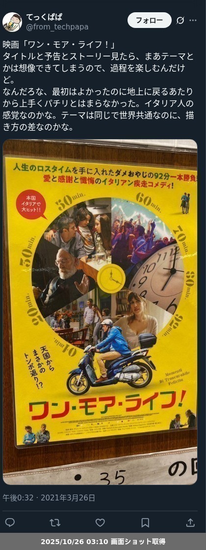 【ネタバレ分離】昨日観た映画、「ワン・モア・ライフ!」の鑑賞レポートです。