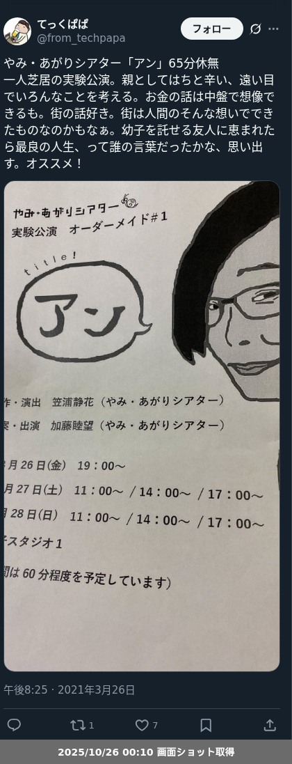 【ネタバレ分離】昨日観た芝居、 やみ・あがりシアター「アン」の観劇レポートです。