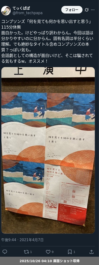 【ネタバレ分離】昨日観た芝居、 コンプソンズ「何を見ても何かを思い出すと思う」の観劇レポートです。