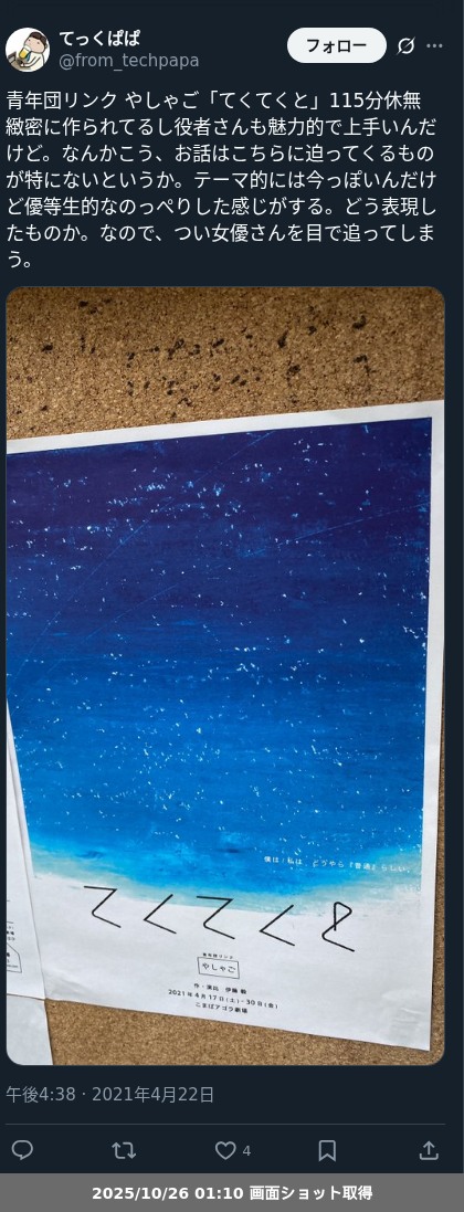 【ネタバレ分離】昨日観た芝居、 青年団リンク やしゃご「てくてくと」の観劇レポートです。