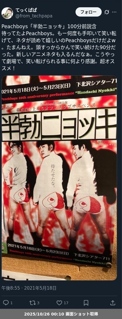 【ネタバレ分離】昨日観た芝居、 Peachboys「半勃ニョッキ」の観劇レポートです。